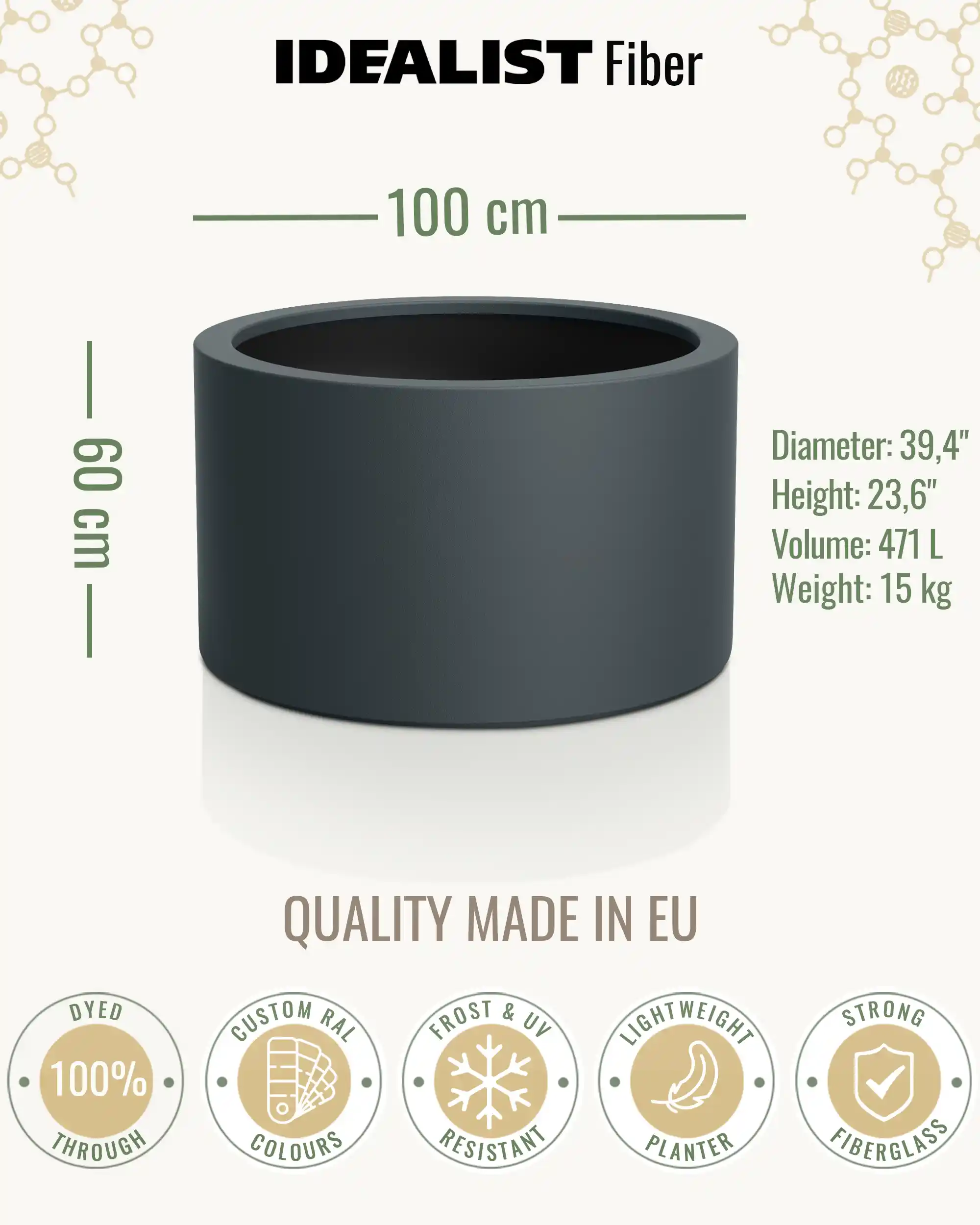 The ingredients to the planters include: Composite stone powder, chopped Fibreglass and a fibreglass netting used from recycled materials.